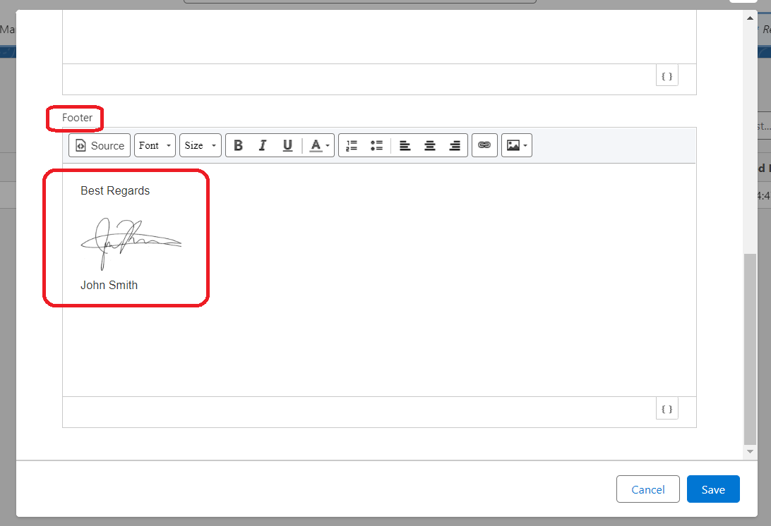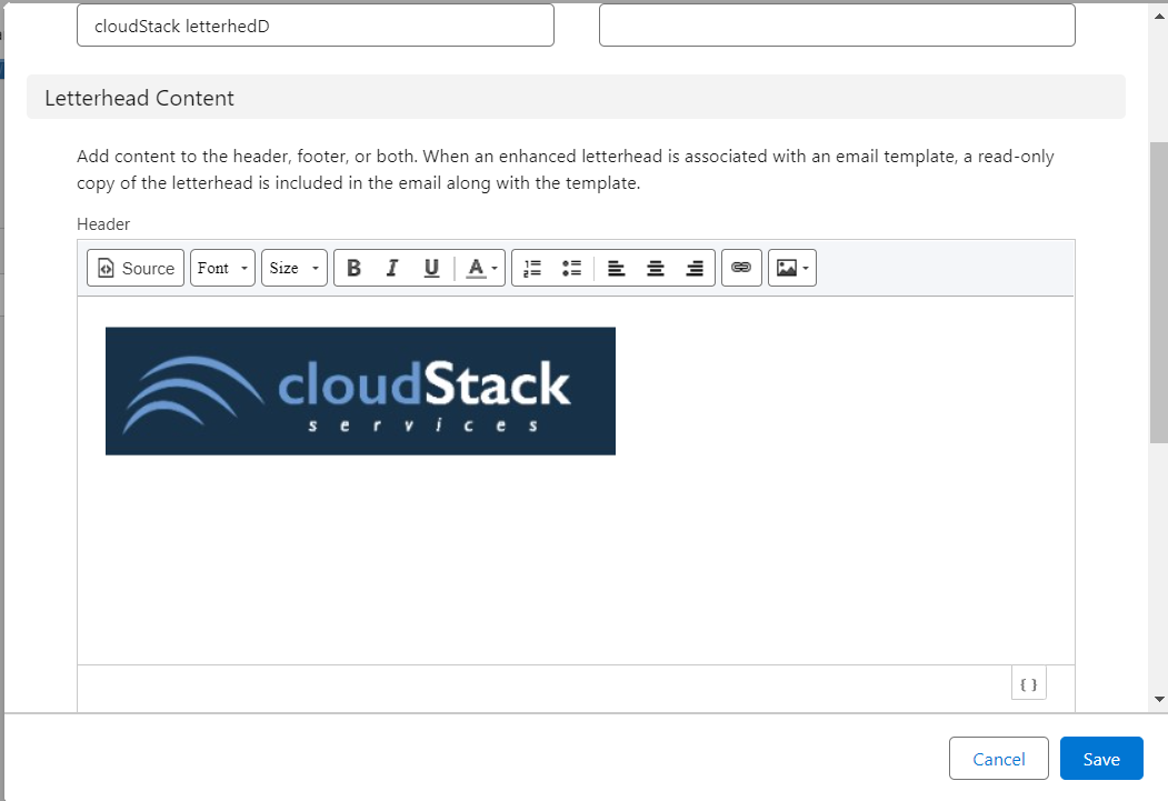 - Use the Rich text editor to add content in the header and footer of your Enhanced Letterhead