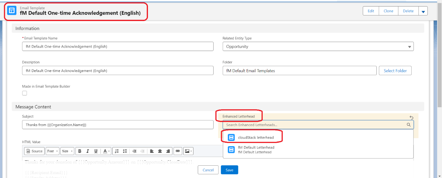 fundRaising Manager leverages Salesforce’s Email Template structure to store the content of all Email templates which are sent out by fundRaising Manager. If fundRaising Manager is used to its extent, where one can setup many different Opportunity Record Types as well as Campaign specific Email Templates, there can be many Email templates which end up existing in a fundRaising Manager setup. In the majority of cases, the email Letterhead and the signature trailer will be common across all templates. If there are dozens of Email Templates in place, it can take considerable time to update them manually. To avoid the inefficient use of time, the Enhanced Letterhead structure with Salesforce can be used to manage this.
